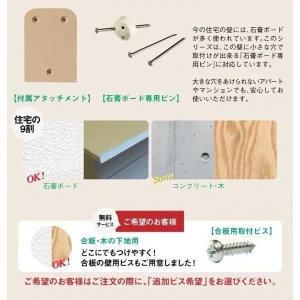 アパートやマンションで壁に穴があけられない。そんなお客様に一般的なアパートの壁で使われる素材・石膏ボードに対応したピン専用の壁掛け方式・アタッチメントを新たに開発しました。