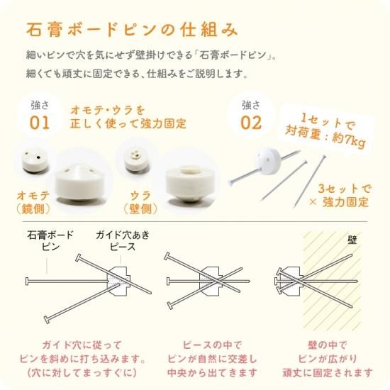 目立たない小さな穴のピンを複数使い固定することで、安心して大きな鏡を壁に掛けられます。